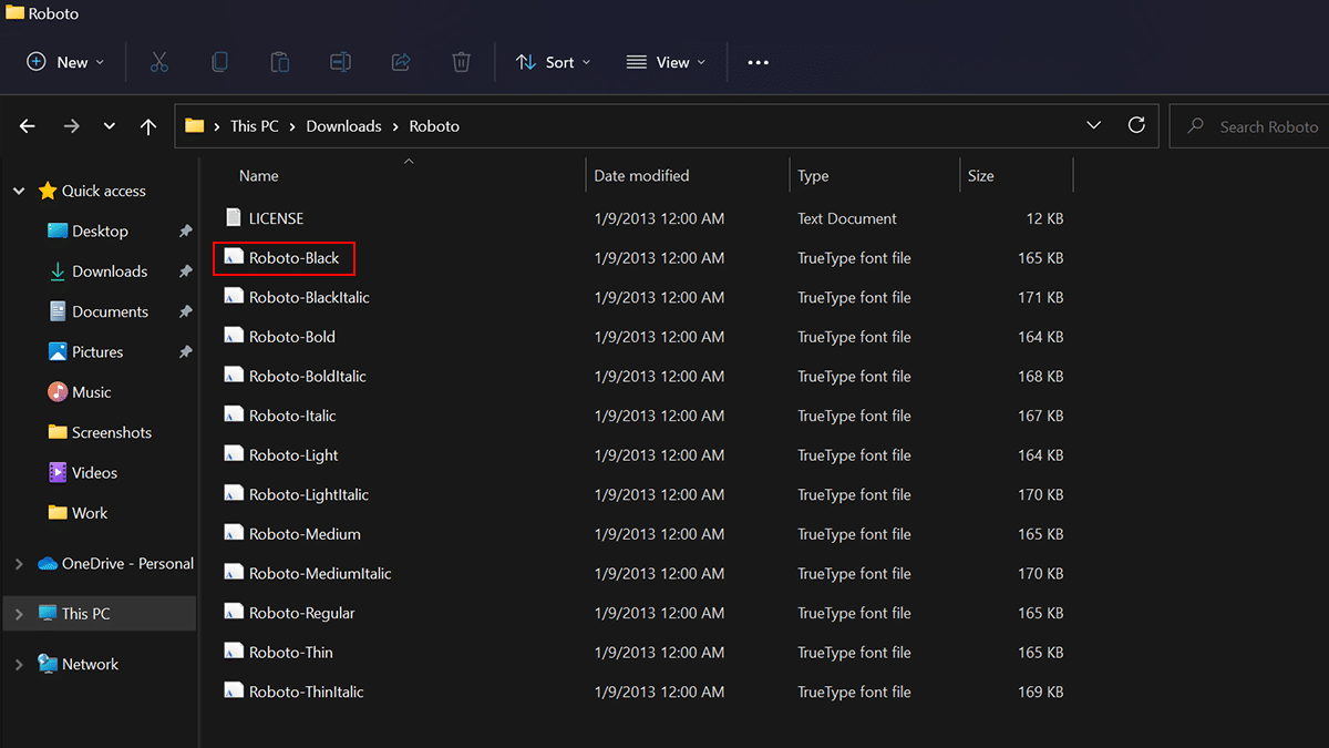 - AçıkDosya Gezgini> Yazı tipi dosyalarıyla klasöre göz atın.