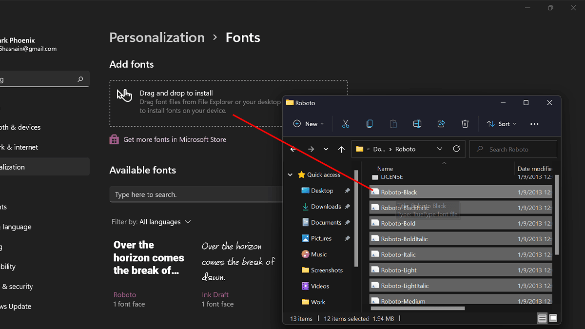 - Tüm dosyaları seçin, sürükleyin ve bırakın.Yüklemek için sürükle ve bırakYazı tiplerini yüklemek için kutu.