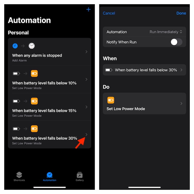 - İPhone -> Otomasyon sekmenizdeki kısayol uygulamasına gidin -> söz konusu otomasyonun yanındaki küçük ileri oklara dokunun.