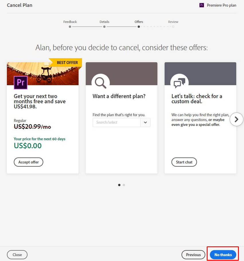 - Adobe müşterilerini kaybetmekten hoşlanmaz ve sizi iptal etmek yerine planınızı değiştirmeye ikna etmeye çalışırlar. SeçinHayır, teşekkürlerZihniniz Adobe'yi iptal etmeye ayarlanmışsa seçenek.