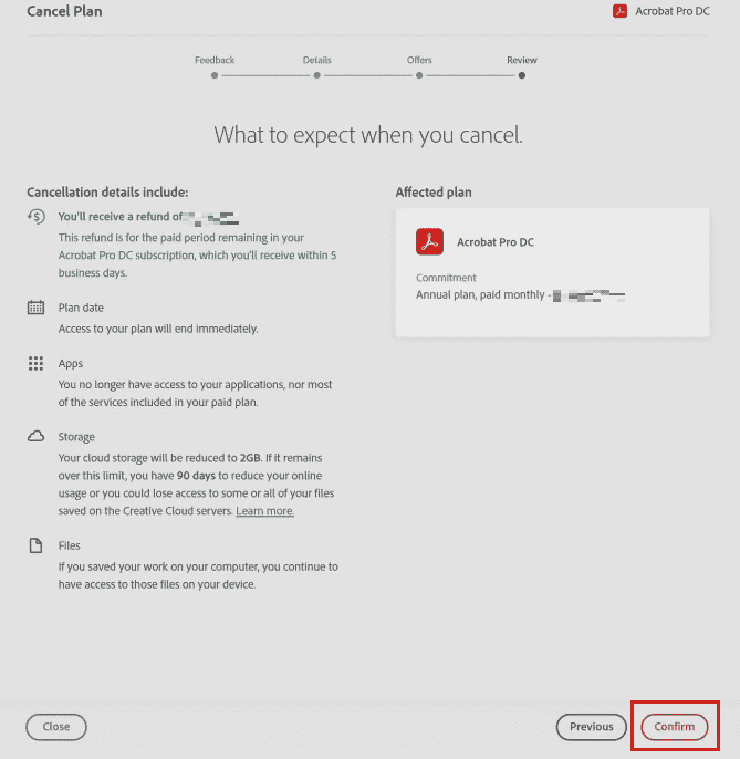 - Son olarak, sonraki sayfa tüm iptal ayrıntılarını görüntüler. Hata olmadığından emin olmak için onları gözden geçirin. SeçmeOnaylamakve Adobe aboneliğiniz iptal edilecektir.
