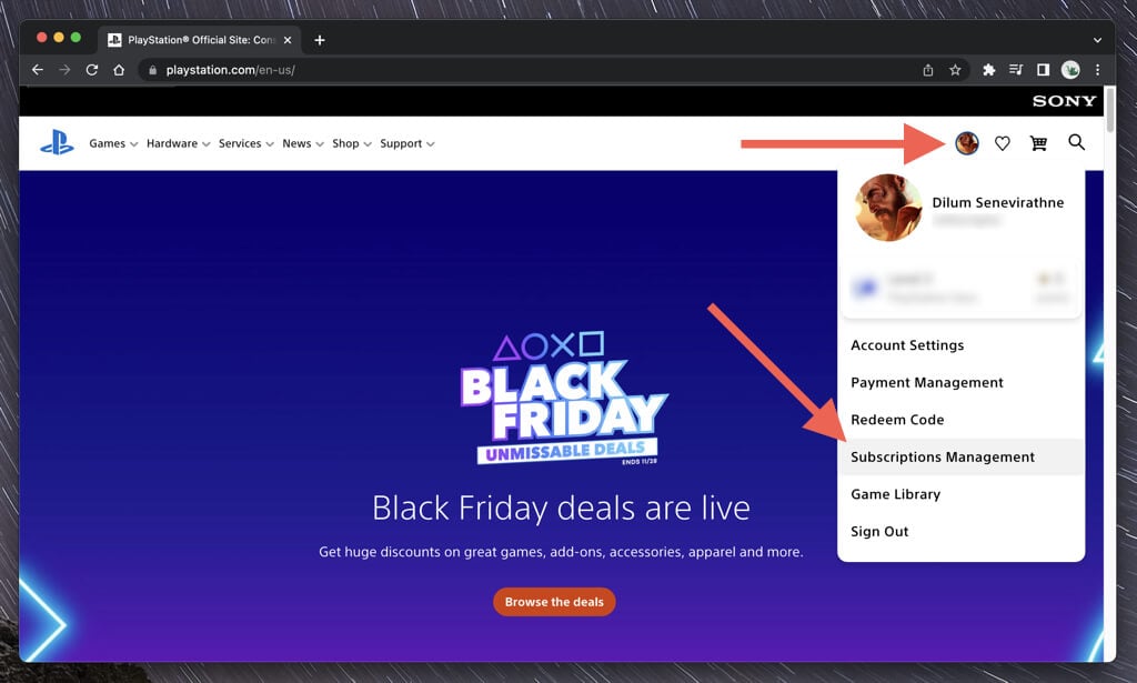 Sadece oturum açPlaystation.comPSN kimlik bilgilerinizle. Hesap iki faktörlü kimlik doğrulama gerektiriyorsa, telefonunuzda aldığınız kodu girerek bunun sizin olduğunu doğrulamanız gerekir. Ardından, ekranın sol üst köşesindeki profil portrenizi seçin ve seçinAbonelik yönetimi.
