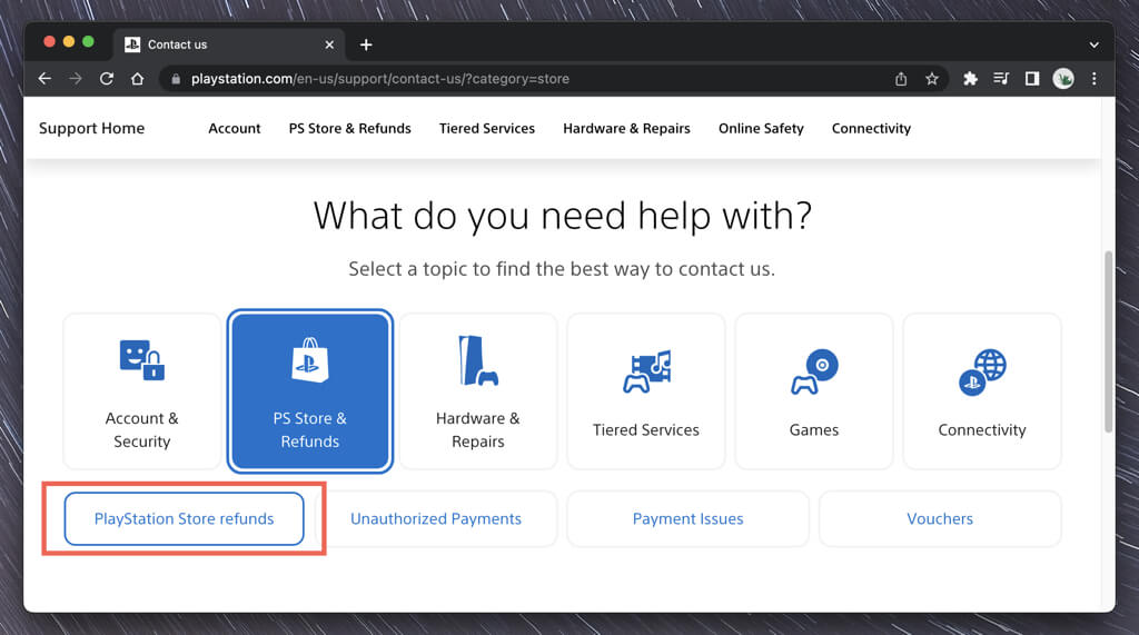 Bunu yapmak için ziyaret edinPlayStation İletişim Destek SayfasıMasaüstü veya mobil cihazdaki bir web tarayıcısı aracılığıyla ve PlayStation Network Hesap Kimlik bilgilerinizle oturum açın. Sonra seçinPS Mağazası ve Geri Ödeme>PlayStation Mağazası geri ödemeler.