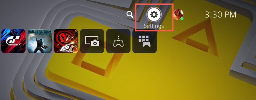 - SeçinAyarlarPS5 ana ekranının sağ üst kısmındaki simge. Bir PS4'te,YukarıDenetleyicinin D-pad'ındaki düğme ve seçinAyarlar.
