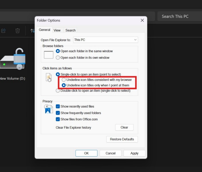 4.AltındaGenel sekmekiKlasör Seçenekleri Penceresi, bulacaksınBir öğeyi açmak için tek tıklayın (seçin) ayarını ayarlayınhemen altındaAşağıdaki bölümleri tıklayın.
