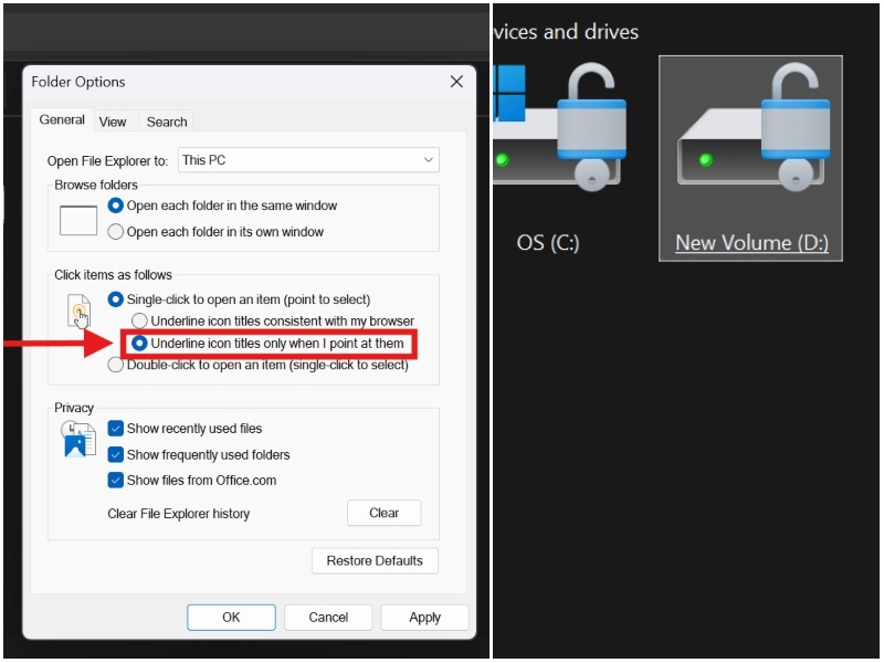 6.Şimdi, bir öğeyi açmak için tek tıklamanın altında (seçmek için işaret et) ayarı, iki alt belirleme var-Tarayıcımla tutarlı simge başlıklarının altını çizVeYalnızca onlara işaret ettiğimde simge başlıklarının altını çiz. Varsayılan olarak,İkinci seçenek seçilecek.