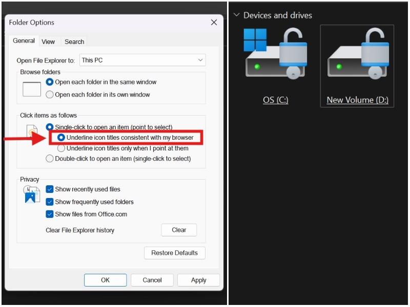 Çift tıklama girişi, Windows 11 PC'lerde ve dizüstü bilgisayarlarda dosyaları ve klasörleri açmak için varsayılan giriş komutudur. Cihazınızda kapatmak istiyorsanız, tek tıklamanın klasör seçenekleri penceresinde bir öğe ayarını açmasını etkinleştirebilirsiniz.
