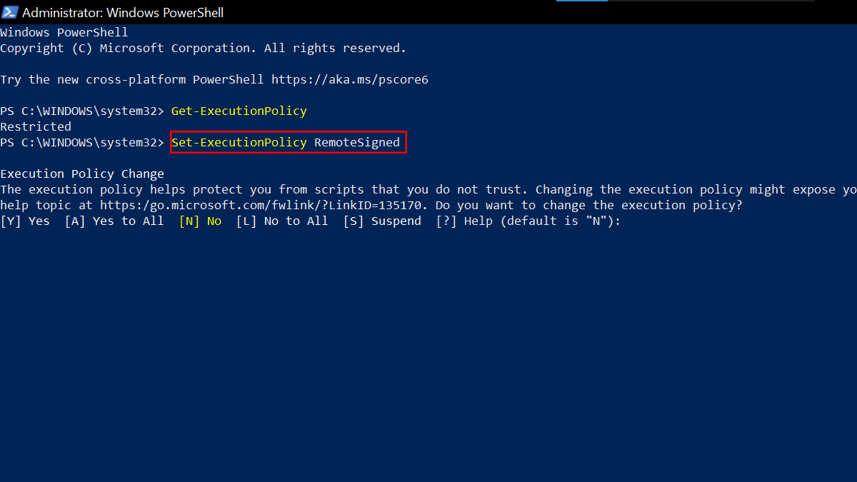 - Değiştirmek için aşağıdaki komutu yazınPowerShell Yürütme PolitikasıKomut dosyalarına izin vermek için> BasınGirmekklavyede.