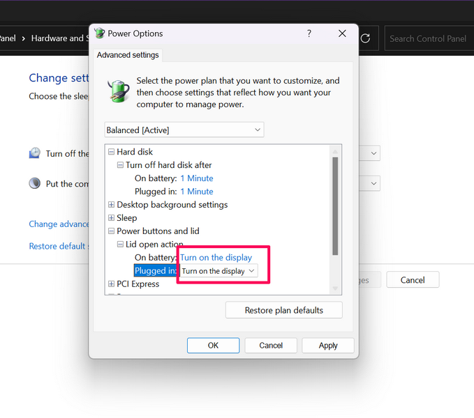 7.Seçtiğiniz güç planının kılavuzunu kullanarak kapak açık eylemi komutunu çalıştırdıktan sonra,Değişim sadece belirli güç planını etkileyecektirWindows 11 dizüstü bilgisayarınızda.