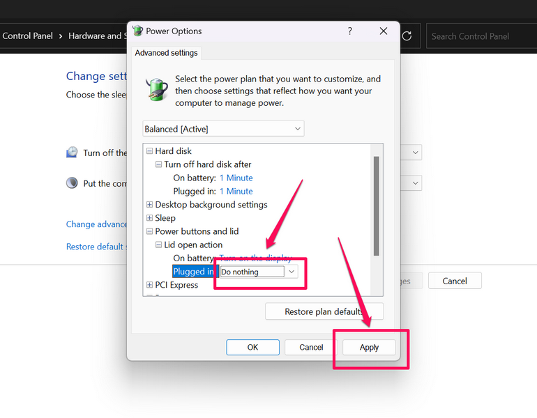 Böylece, Windows 11 dizüstü bilgisayarınızdaki kapak açılı eylemini kontrol panelinden değiştirmek için aşağıdaki adımları izleyebilirsiniz: