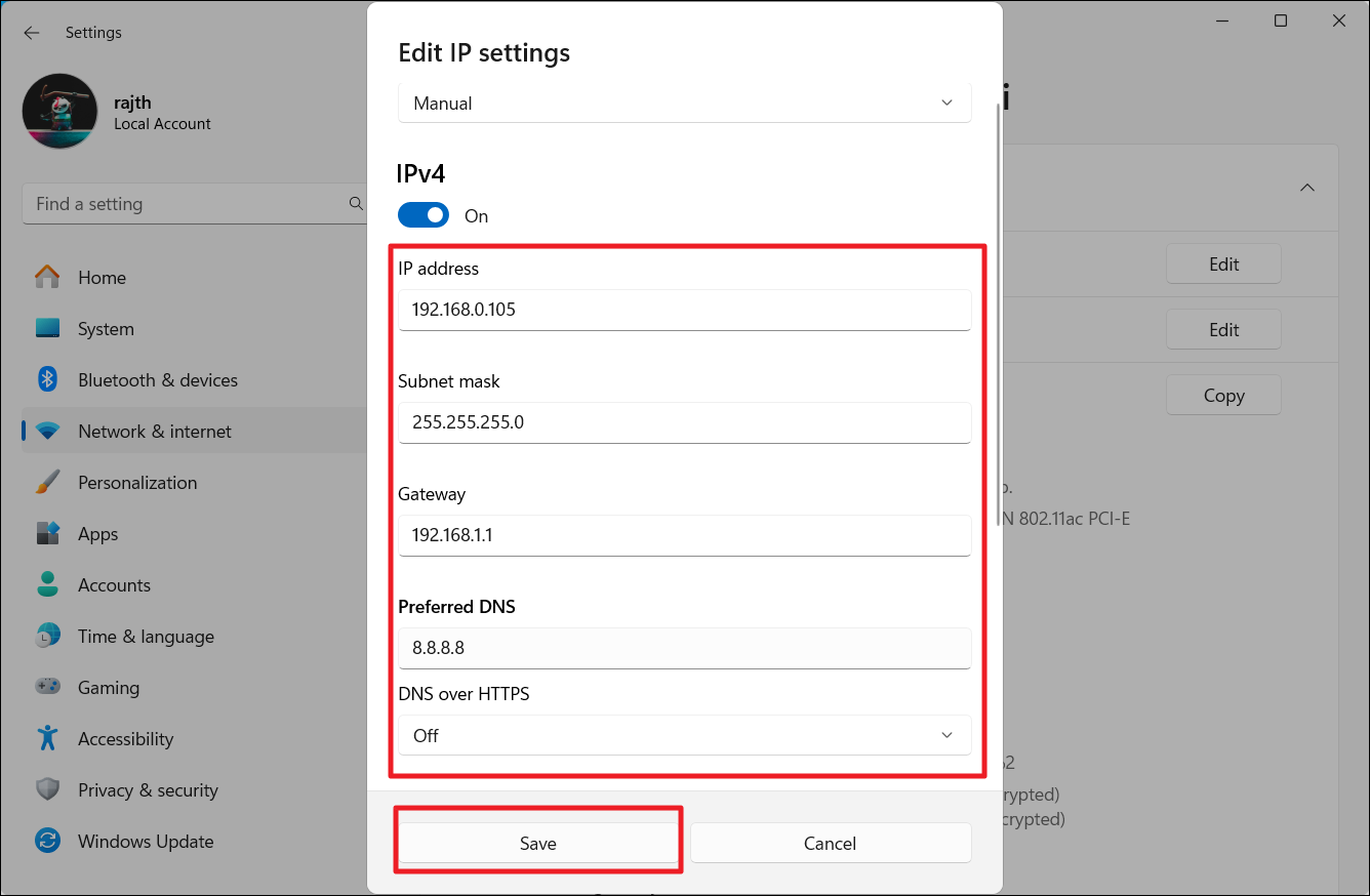 9. Tıklayın “Kaydetmek”Statik IP ayarlarını uygulamak için.