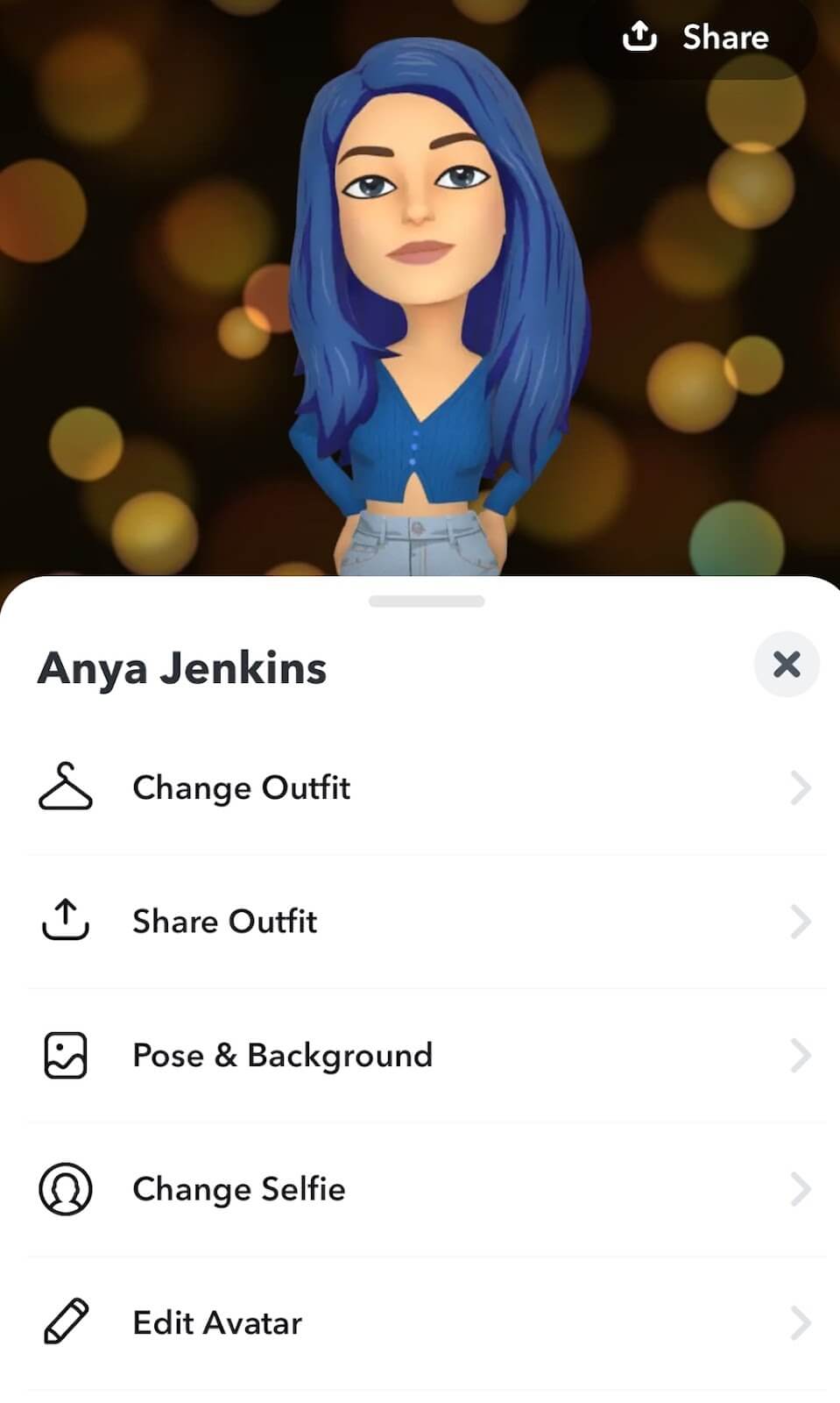 Bitmoji'nizi profil ayarlarınızda özelleştirebilirsiniz. Henüz bir bitmoji yoksa, seçinBitmoji Oluştur. Aksi takdirde, seçinBitmoji simgesive özelleştirme seçeneklerinden birini seçin:Kıyafetini değiştir-Poz ve arka plan-Selfie'yi değiştir, veyaAvatar'ı Düzenle.