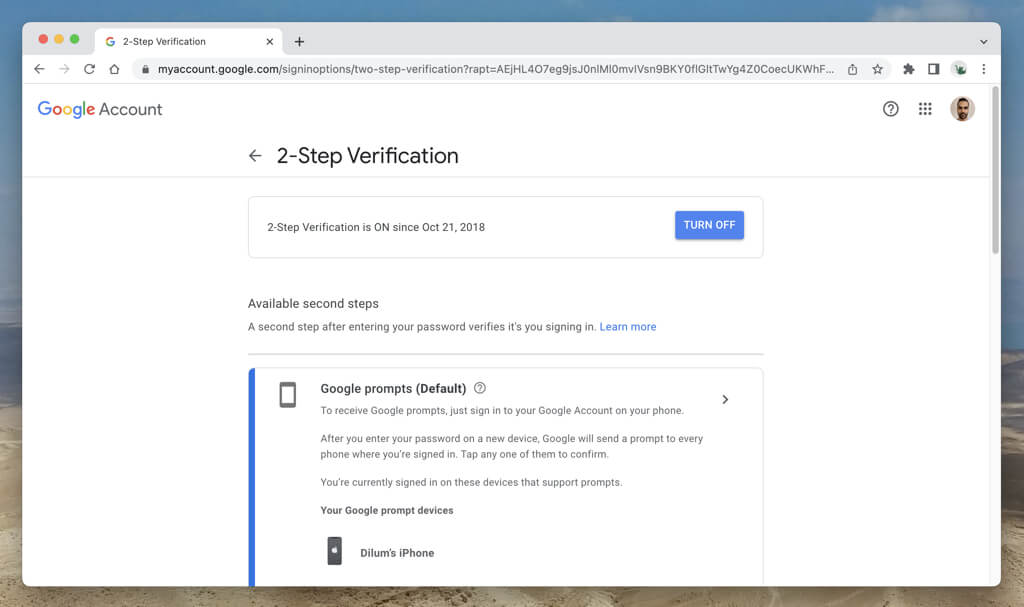 İki aşamalı doğrulama, hesabınıza bir isteğe dokunmanızı veya hesabınıza erişmeden önce mobil cihazınıza gönderilen bir kod kullanmanızı gerektiren ekstra bir güvenlik katmanı ekler. Ayrıca 2 adımlı doğrulamayı da bağlayabilirsiniz.Google Authenticator.
