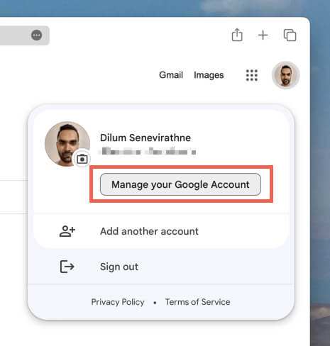 - Bir web tarayıcısı açın,Google Hesap Oturum Açma Sayfasıve Google hesabınıza giriş yapın. Zaten bir Google hizmetinde (örneğin, Gmail, Arama veya Fotoğraflar) imzaladıysanız, web sayfasının sağ üst kısmındaki profil resim simgeni seçin ve seçinGoogle Hesabınızı Yönetin.