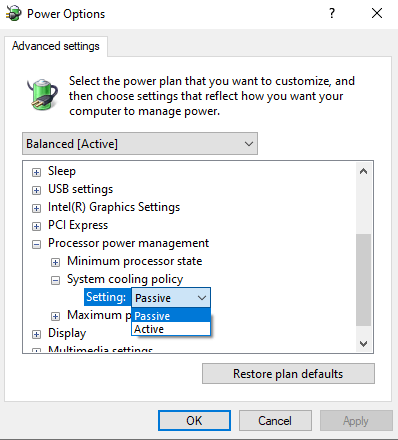 Pasif soğutma stratejisinin, soğutma sistemlerindeki pil tüketimini performansın üzerinde desteklediğini unutmayın. PC'nizin performansı için aktif bir politika seçin. Tercih ettiğiniz güç planları için gelişmiş güç ayarları altında, politikayı gerektiği gibi ayarlayabilirsiniz.