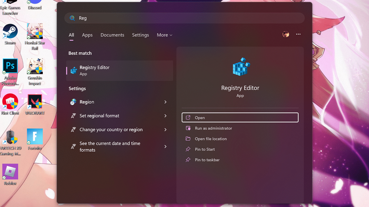 - AçıkBaşlangıç> AraKayıt Defteri Editörüve sonra tıklayınAçık.
