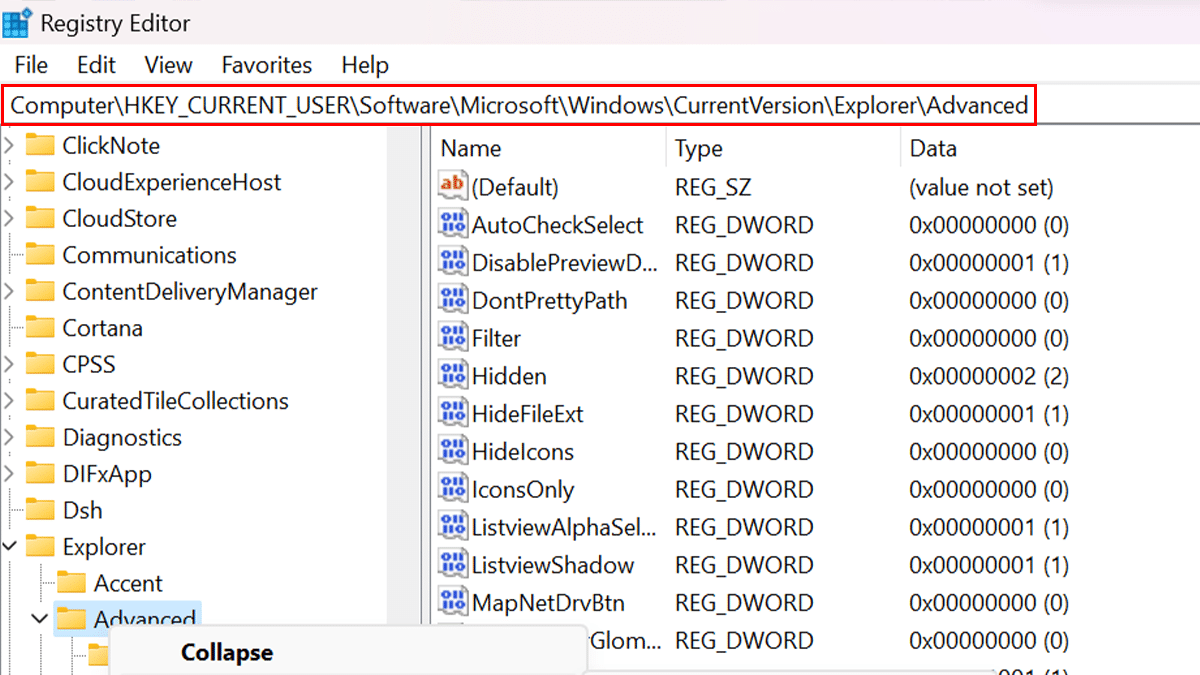 HKEY_CURRENT_USERSoftwareMicrosoftWindowsCurrentVersionExplorerAdvanced