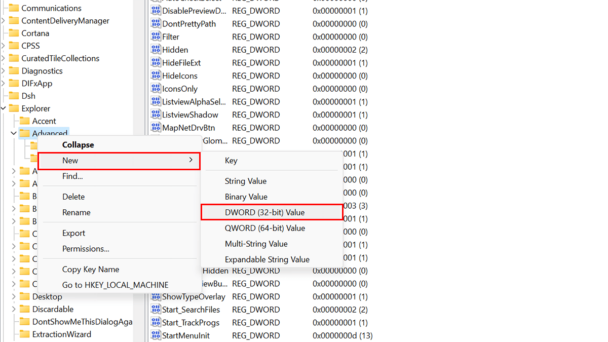 - Sağ tıklayınGelişmişAnahtar, seçinYenive tıklayınDWORD (32 bit) değer.