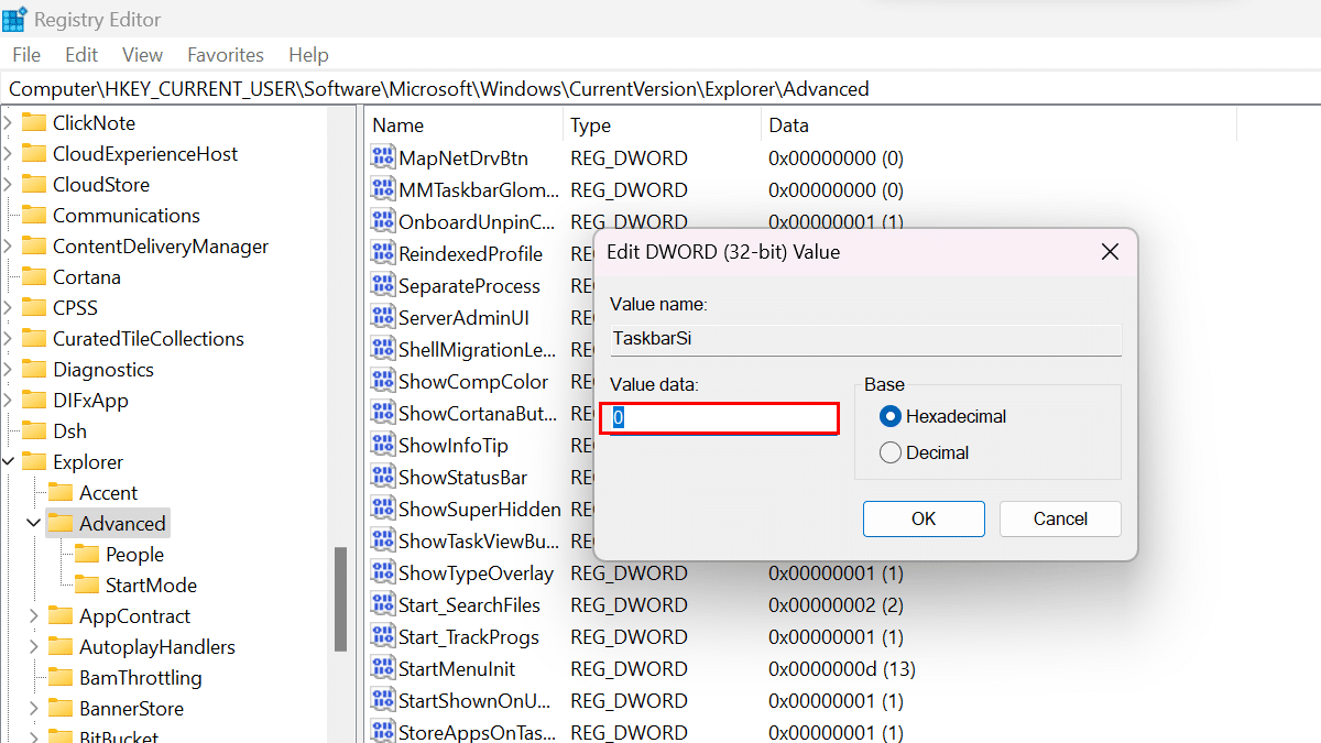 Kayıt defterini kullanarak Windows 11'deki görev çubuğu boyutunu nasıl değiştireceğiniz aşağıda açıklanmıştır