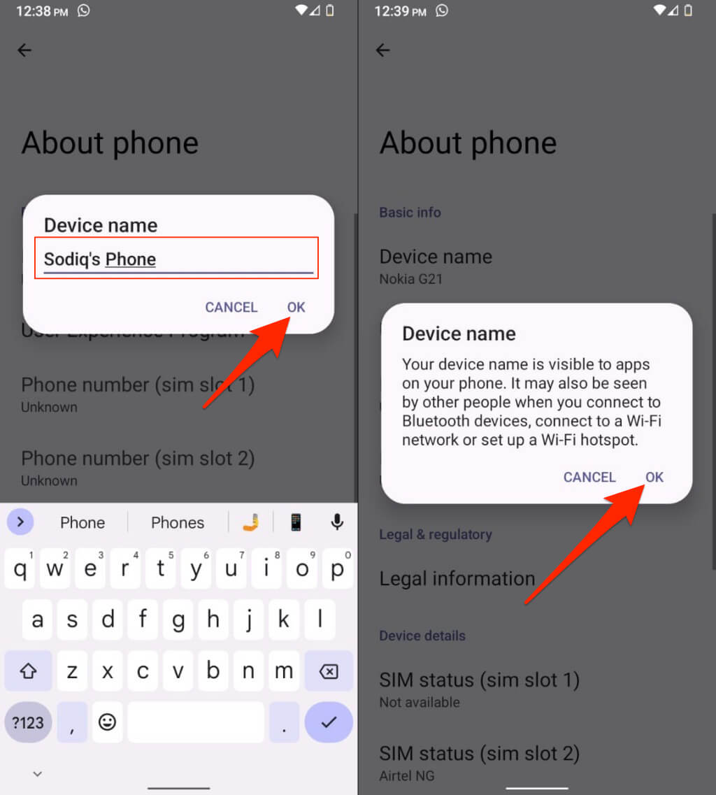 - Telefonunuzun geçmesini istediğiniz yeni adı girin ve dokununTamamlamak.