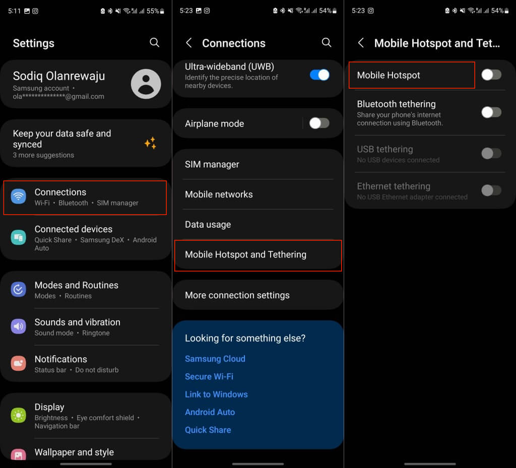 - Dokunun ve tutunMobil HotspotCihazınızın sistem tepsisinde simge. Alternatif olarak,Ayarlar>Bağlantılar>Mobil Hotspot ve Tethingve seçMobil Hotspot.
