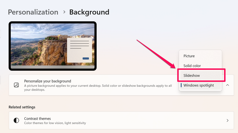 Windows Spotlight özelliğinin aksine, Windows 11'deki slayt gösterisi özelliği, kullanıcıların PC'leri veya dizüstü bilgisayarları için belirli duvar kağıtlarını seçmelerine ve bunlardan otomatik olarak döngü yapmalarına olanak tanır. Kullanıcılar ayrıca bu özelliğe sahip Windows 11 cihazlarındaki duvar kağıtlarının değişim döngüsü için tercih edilen bir zaman aralığı ayarlayabilir.