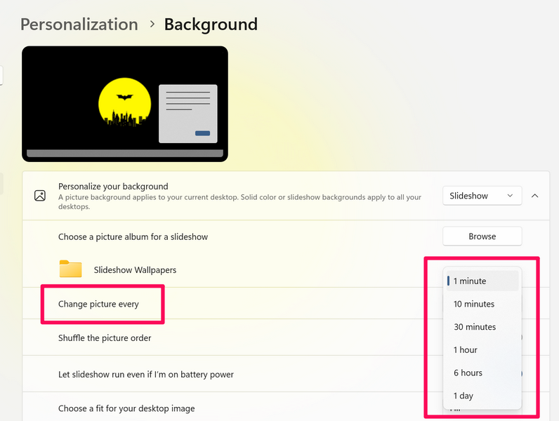 6.Bundan sonra, yanındaki kutuyu tıklayabilirsiniz.Resmi değiştirDuvar kağıdı slayt gösterisi için tercih edilen bir zaman aralığını ayarlama seçeneği. Seçenekler 1 dakika ile 1 gün arasında değişir.