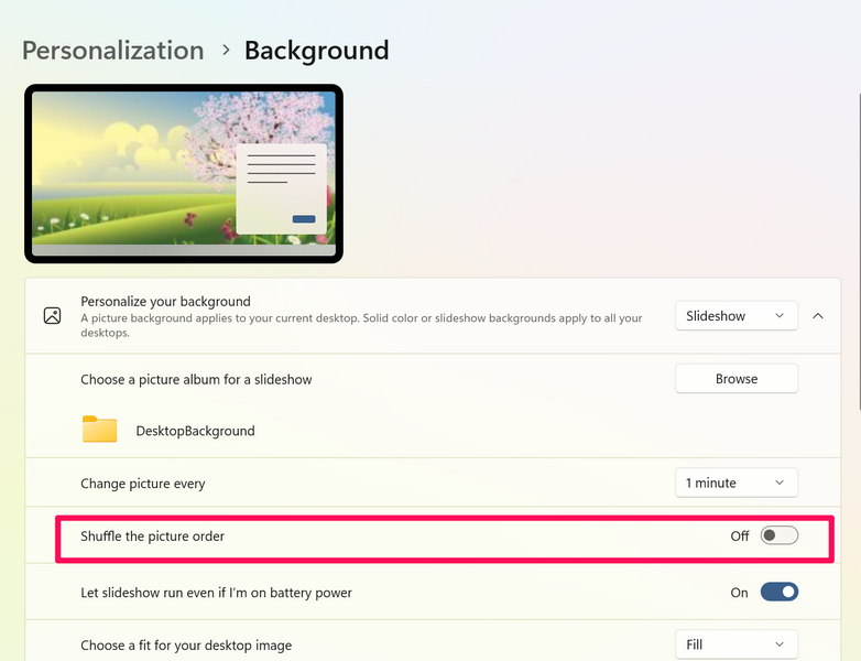 8.Ardından, geçişi etkinleştirebilir/ devre dışı bırakabilirsiniz.Pil gücünde olsam bile slayt gösterisi çalışsınseçenek. Bunu etkinleştirmek, Windows 11'in dizüstü bilgisayarınız güce bağlı olmasa ve doğal olarak daha fazla pil tükettiğinde bile duvar kağıtlarını otomatik olarak değiştirmeye devam etmesini sağlayacaktır.
