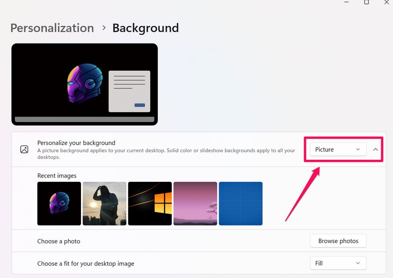 9.Ardından, yanındaki kutuyu tıklayabilirsiniz.Masaüstü resminiz için bir uyum seçinWindows 11 PC'nizde veya dizüstü bilgisayarınızda duvar kağıtlarının nasıl göründüğünü seçme seçeneği. Üstteki önizleme bölümünde listedeki her bir seçenekin önizlemesini alabilirsiniz.