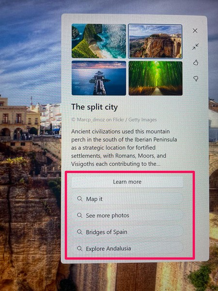Bunun yerine, Windows Spotlight özelliği, çarpıcı, yüksek çözünürlüklü görüntüleri kaynaklamak ve Windows 11 PC'nizde veya dizüstü bilgisayarınızda duvar kağıtları olarak ayarlamak için Bing kullanır. Dahası, sadece Windows Spotlight ile her gün taze duvar kağıtları arasında geçiş yapmakla kalmaz, aynı zamanda söz konusu özellik ile mevcut duvar kağıdınız hakkında daha fazla bilgi edinebilirsiniz.