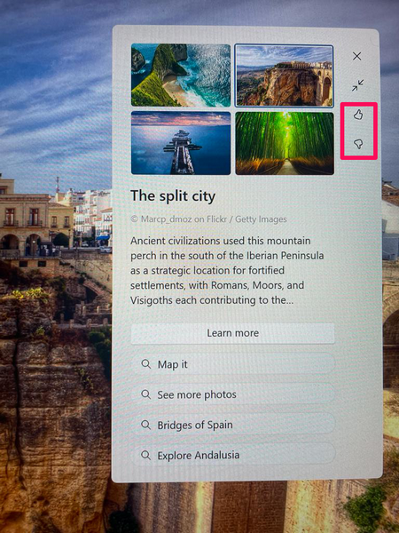 Ayrıca,BeğenmekveyaSevmemekTercihinizi kaydetmek için bindirme kullanıcı arayüzünün sağ kenarında bulunan düğmeler. Bir görüntüyü seviyorsanız, Windows Spotlight bunu dikkate alacak ve PC'nizdeki veya dizüstü bilgisayarınızdaki duvar kağıtları ile benzer görüntüler ayarlayacaktır. Bir görüntünün hoşlanmaması, sevilmeyen olana benzer daha az görüntü gösterecektir.