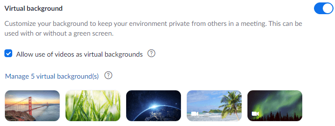 - İçindeToplantısekme, aşağı kaydırınSanal arka planBölüm ve sanal arka planların etkin olduğunu doğrulayın. Özellik devre dışı bırakılırsa, etkinleştirmek için Durum geçişini seçin. İsterseniz, yanındaki kutuyu kontrol edinVideoların sanal arka plan olarak kullanılmasına izin verin.