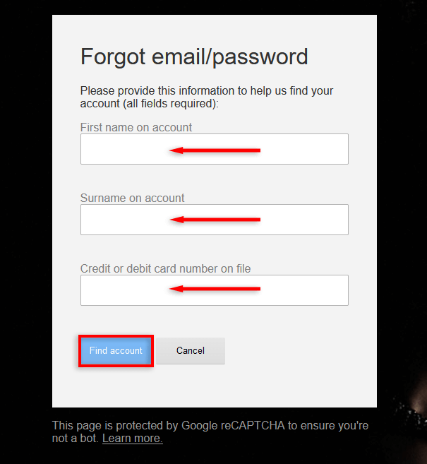 - Hesabınızda kullanılan ad ve soyadınızı ve kredi/banka kartı numaranızı yazın, ardından seçinHesabı Bul.
