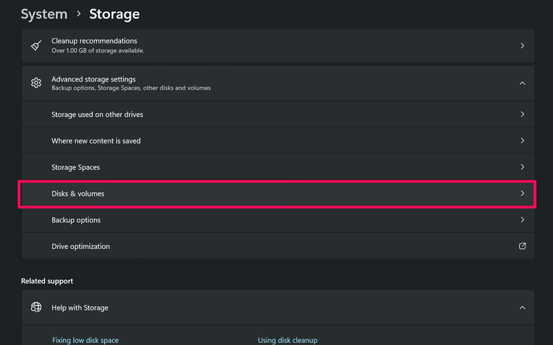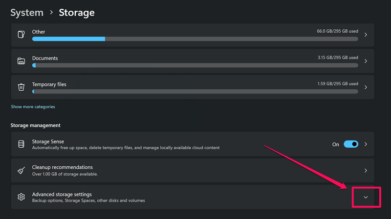 3.TıklayınokyanındaGelişmiş Depolama AyarlarıBölümü genişletmek için.