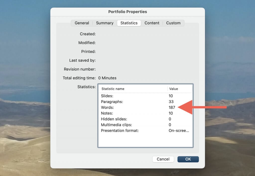 - SeçmeTüm özellikleri göster(Pencereler) veyaİstatistik(macOS). Sunumun kelime sayısını yanında görmelisiniz.Kelimeler.