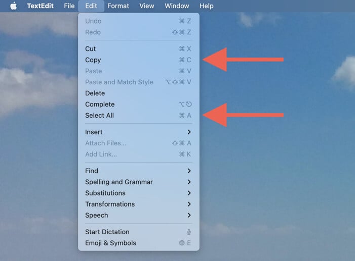 - BasmakCtrl+A(PC) veyaCMD+A(Mac) dosyadaki tüm metni vurgulamak için ve ardındanCtrl+C(PC) veyaCMD+C(Mac) Seçilen metni panoya kopyalayın. Ayrıca kullanabilirsinizHepsini seçVeKopyaOnlardaki seçeneklerDüzenlemekKlavye kısayollarını tercih etmiyorsanız menü.