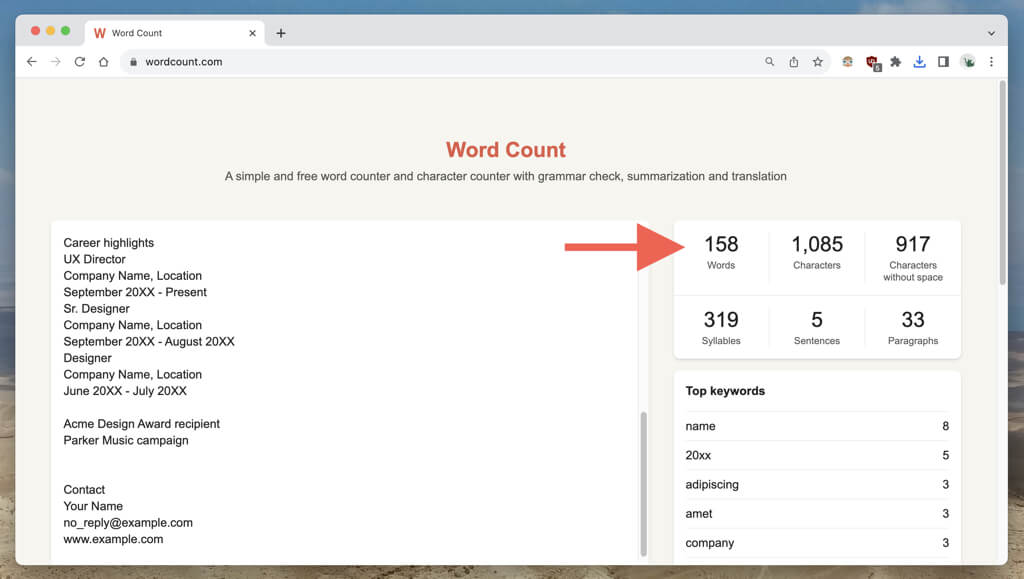- İçeriği Microsoft Word (ekranın sol alt köşesindeki kelime sayımını görmelisiniz) veya Google Dokümanlar gibi bir kelime işlemcisine yapıştırın (seçin)Aletler>Kelime sayımımenü çubuğunda). Ancak, her şeyi bir siteye kopyalamaktır.Kelime sayımı.