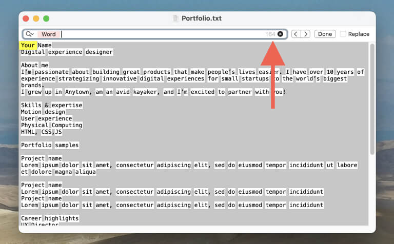 Textedit'te .txt dosyasını açın ve basınCMD+F(veya seçinDüzenlemek>Bulmakmenü çubuğunda) arama aracını çağırmak için. O zaman seçinAramaksol köşesinde simgeAramakAlan ve SeçinDesen Ekle>Herhangi bir kelime karakter. Kelime sayısı, sağ köşesinde görünmelidir.Aramakalan.