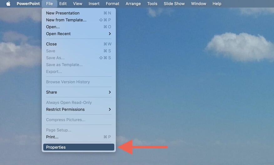 - Gidip gelmekDosya>Bilgi(Windows)/Özellikler(macOS) menü çubuğunda.