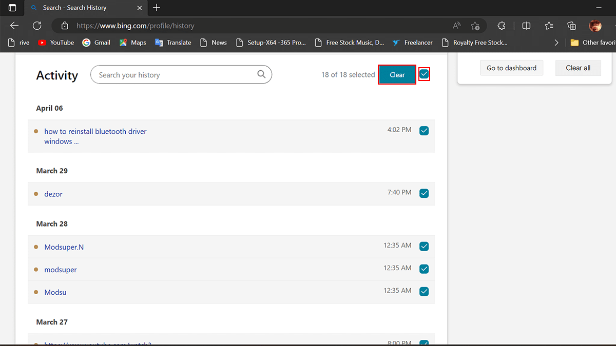 - Aşağı kaydır> "Aktivite”Bölüm> Bunları geçmişten kaldırmak için tüm arama sorgularını kontrol edin>Temizlemekdüğme.