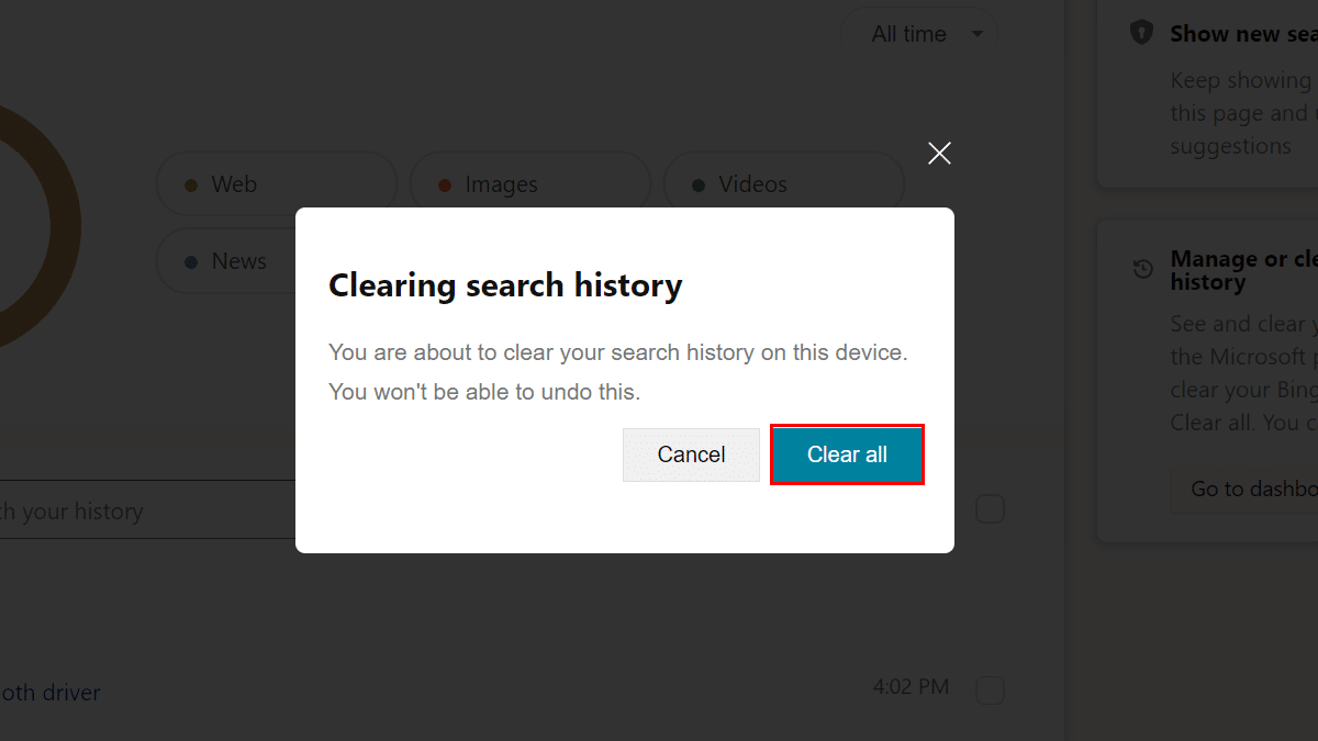 - TıklayınHepsini temizlemek"Arama geçmişinizi yönetin veya temizleyin”Tüm geçmişi silmek için bölüm.