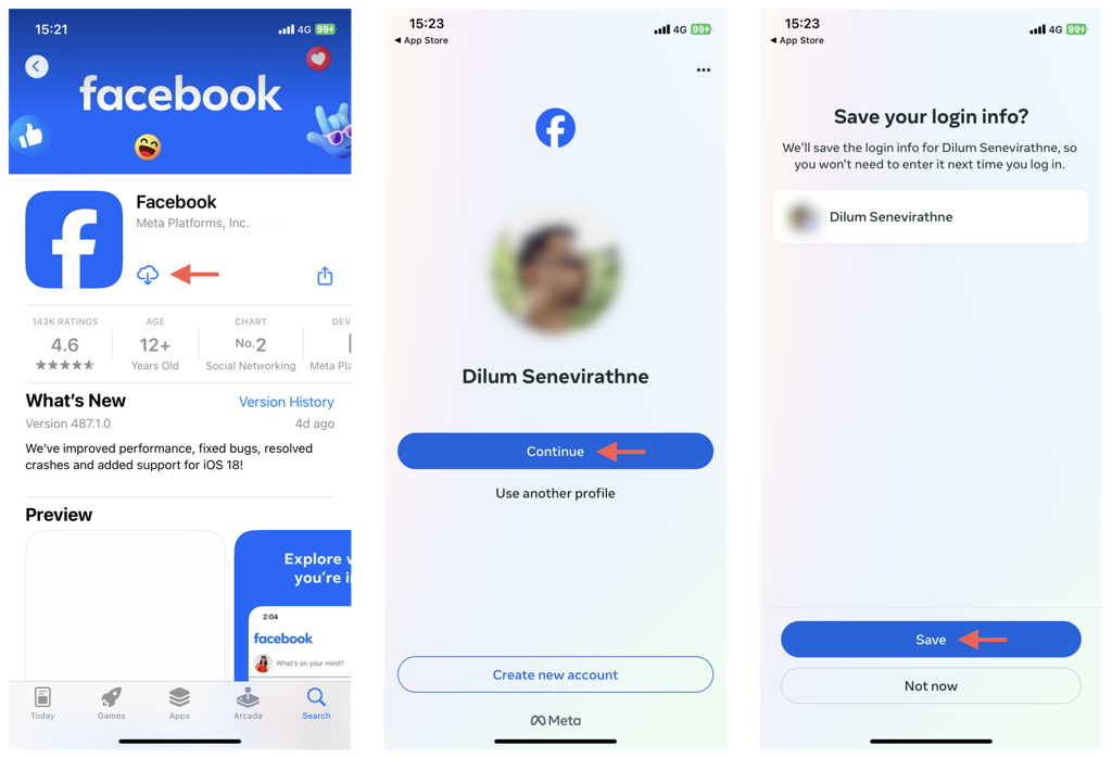 - Meta hesabınızı seçin ve dokununDevam etmek. Bir hesap seçimi ekranı görmüyorsanız, manuel olarak oturun, ancak seçinKaydetmeküzerindeGiriş bilgilerinizi kaydedin mi?Uygulamayı bir sonraki kaldırıp yeniden yüklediğinizde manuel olarak imzalamayı önlemek için ekran.
