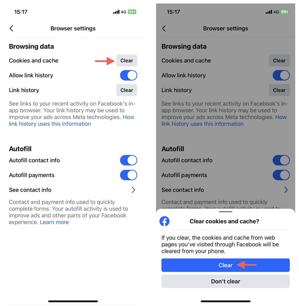 Facebook'un tarayıcı içi önbelleğini temizleyin