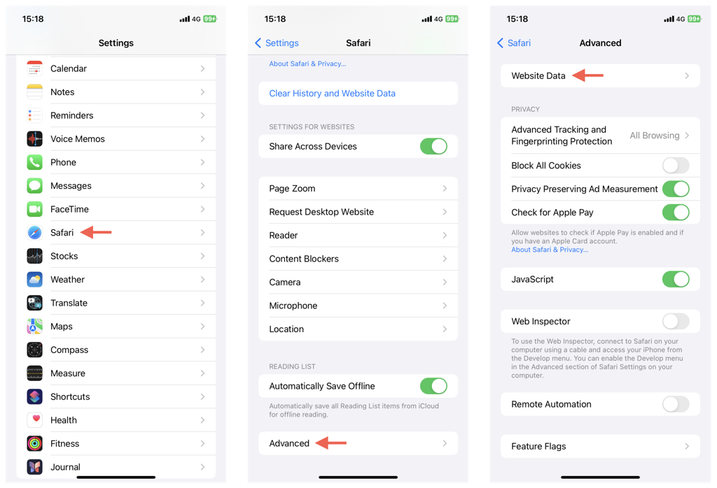 - Gidip gelmekSafari>Gelişmiş>Web sitesi verileri.
