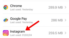 4. Adım:Instagram uygulamasını bulana kadar uygulamalar listesinde ilerleyin, ardından dokunun.