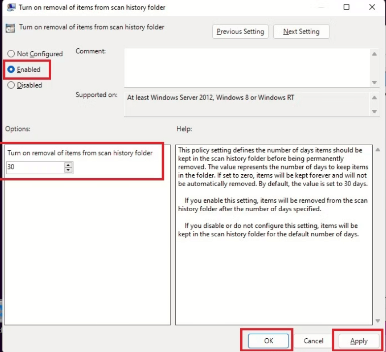 Şimdi, tarama geçmişi klasöründeki öğeler, belirtilen gün sayısından sonra otomatik olarak silinecektir.
