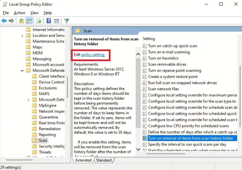 Adım 7:Sağ panele bakın, iki kez tıklayın.Tarama geçmişinden öğelerin kaldırılmasını açın”Politika ayarı.