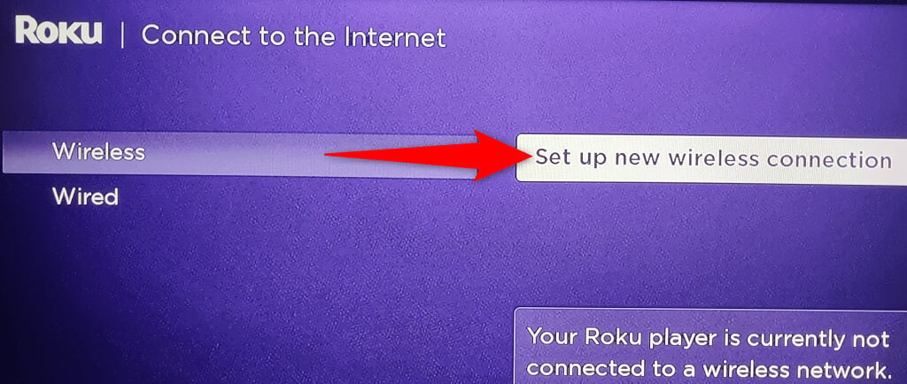 - Roku bir ağa bağlanmayı istediğindeKablosuz>Yeni kablosuz bağlantı kurun. SeçmeKabloluCihazınızı bir Wi-Fi ağına bağlamak istediğiniz gibi.