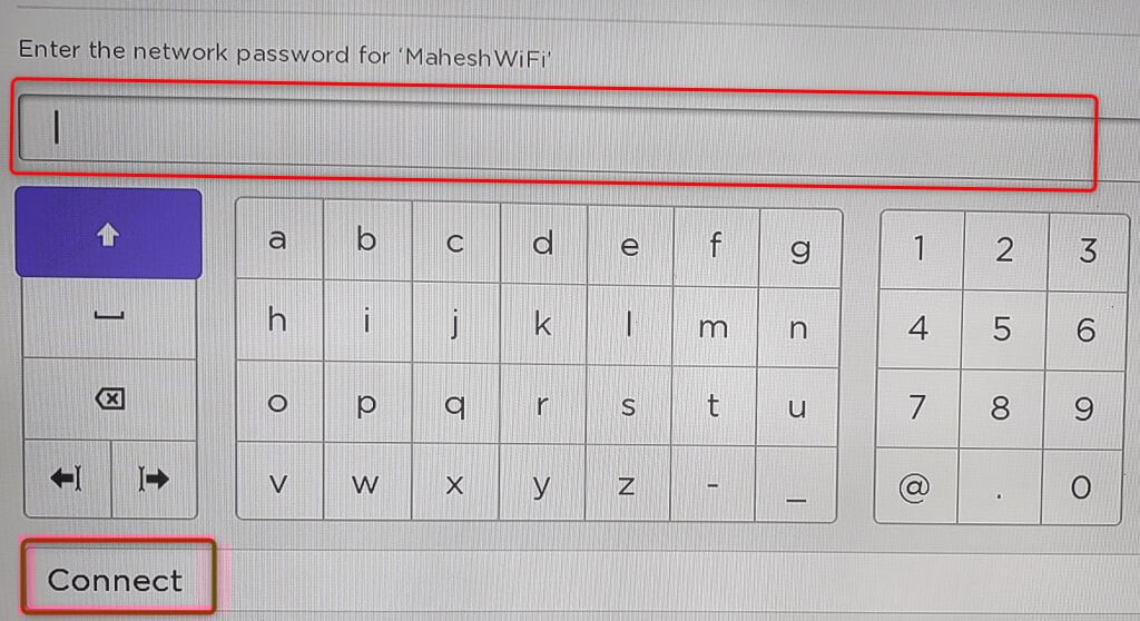 - Roku sizden Wi-Fi ağınızın şifresini girmenizi isteyecektir. Ekran klavyesini kullanarak şifreyi yazın, ardından seçinBağlamak.