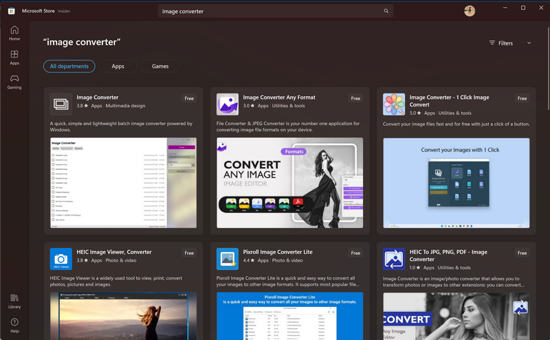 HEIC görüntülerinizi JPG'ye dönüştürmek için web araçlarını kullanmayı sevmiyorsanız, Windows 11 PC veya dizüstü bilgisayarınızdaki Microsoft Store'dan görüntü dönüştürme araçlarını indirebilir ve yükleyebilirsiniz. Basitçe yapabilirsinMicrosoft Store uygulamasını açınCihazınızda ve kriterinizi yerine getiren görüntü dönüştürücüleri aramak için arama çubuğunu kullanın.